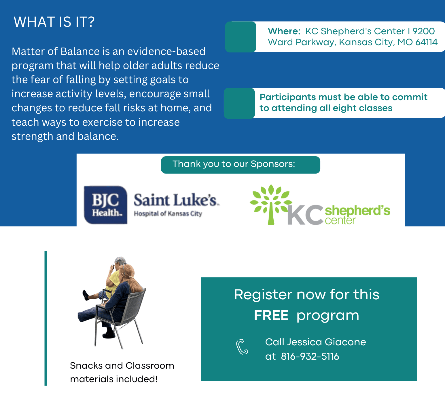 A Matter of Balance is an evidence-based program that will help older adults reduce the fear of falling by setting goals to increase activity levels, encouraging small changes to reduce fall risks at home, and teaching exercises to increase strength and balance. Sessions include classroom instruction and some exercises. Classroom materials are included.
